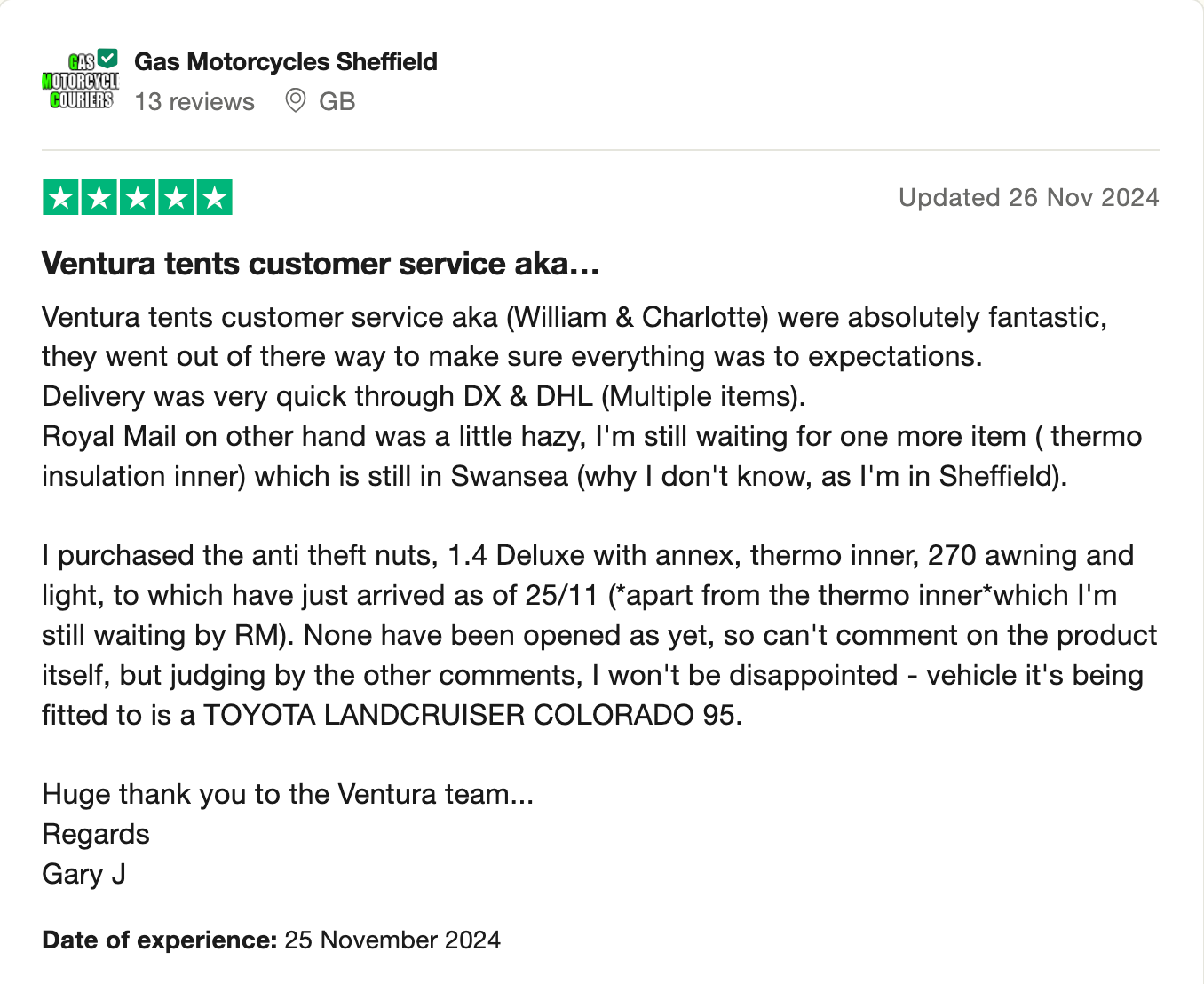 We go above & beyond, we’re known for our exceptional customer service. We’ve shipped a complete fixing kit to a customer out in Kenya. We even once swapped an aluminium roof tent frame for a customer that accidentally drove through a height barrier at a McDonald’s drive through!