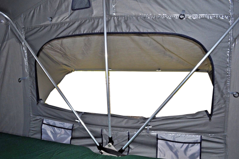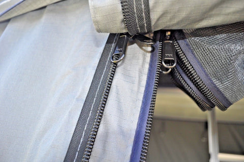The zip on annex is one of the best features to complete the roof top tent system. This provides a whole other room, which can be used to keep a kitchen, your wet or dirty clothing or other items. You even have enough room to sleep 2-4 people in there. The main annex is made from the same durable and waterproof material that is on the outer of the tent. There is 1 entrance and 2 windows to either side, these all have anti insect netting integrated, so you can have the option of fully opened, open with anti insect netting or fully closed. It has a fully waterproof PVC groundsheet on the floor which is zipped together with the main annex.