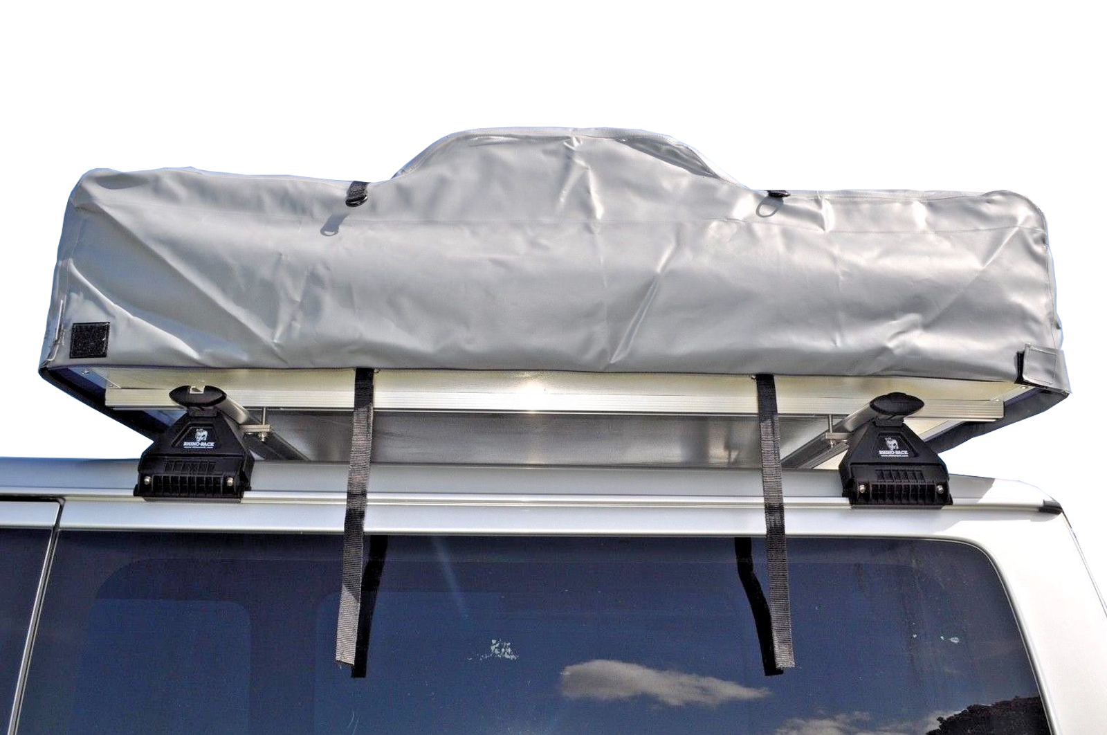 Our roof tents feature an assisted opening mechanism, making set up incredibly fast and easy. One man operation allows it to fold out in seconds to full height. The roof tent attaches to cars, vans, 4x4s, pick ups and trailers on roof bars or a roof rack. When you have it packed up, it’s covered by a UPVC, heavy duty waterproof cover which is sealed/zipped all around.