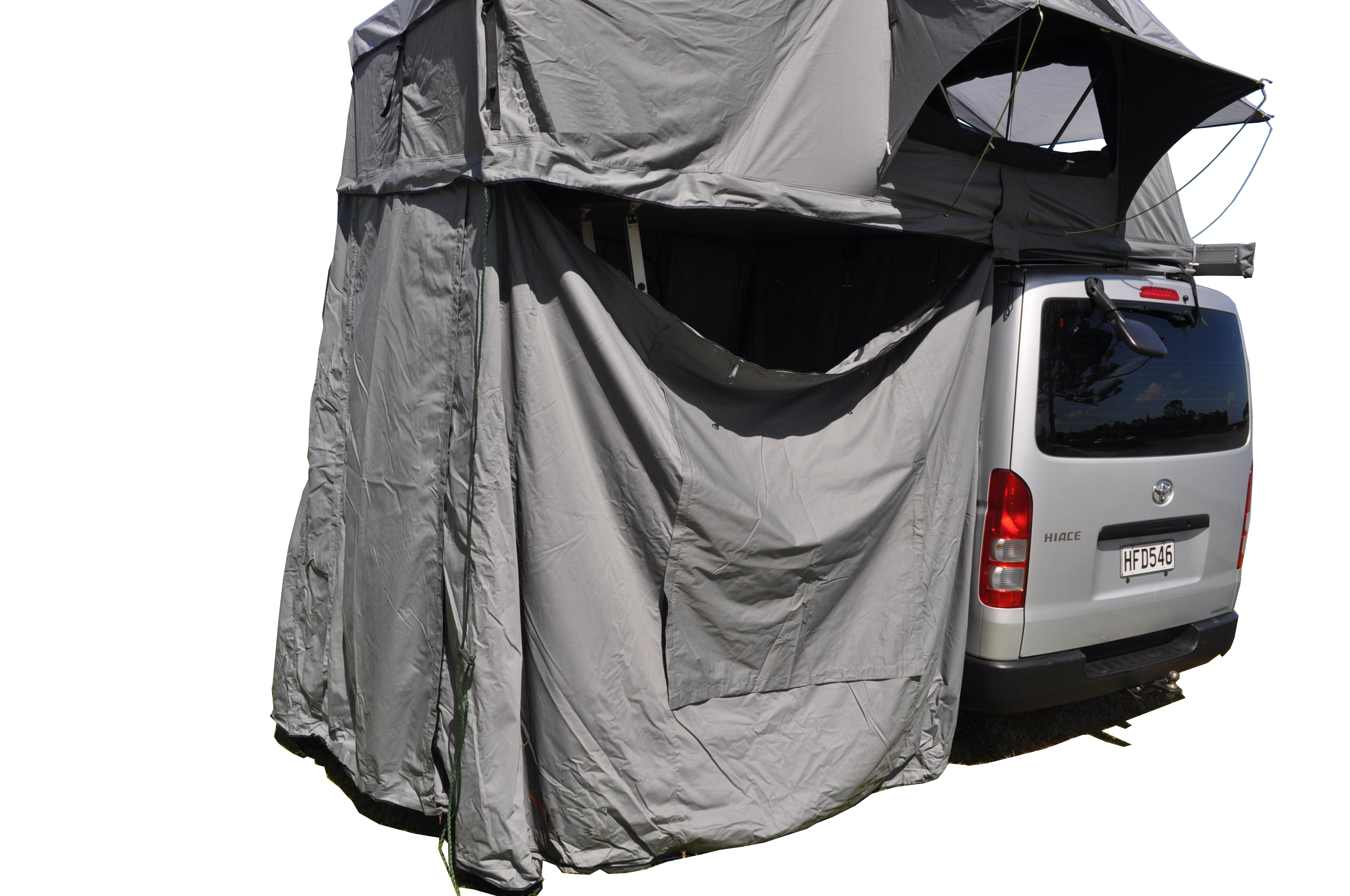 The zip on annex is one of the best features to complete the roof top tent system. This provides a whole other room, which can be used to keep a kitchen, your wet or dirty clothing or other items. You even have enough room to sleep 2-4 people in there. The main annex is made from the same durable and waterproof material that is on the outer of the tent. There is 1 entrance and 2 windows to either side, these all have anti insect netting integrated, so you can have the option of fully opened, open with anti insect netting or fully closed. It has a fully waterproof PVC groundsheet on the floor which is zipped together with the main annex.